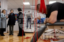 Britain's Princess Anne, second left, visits a rehabilitation center for Ukrainian war veterans, in Kyiv, Tuesday Sept. 30, 2025. (Thomas Peter/Pool via AP)