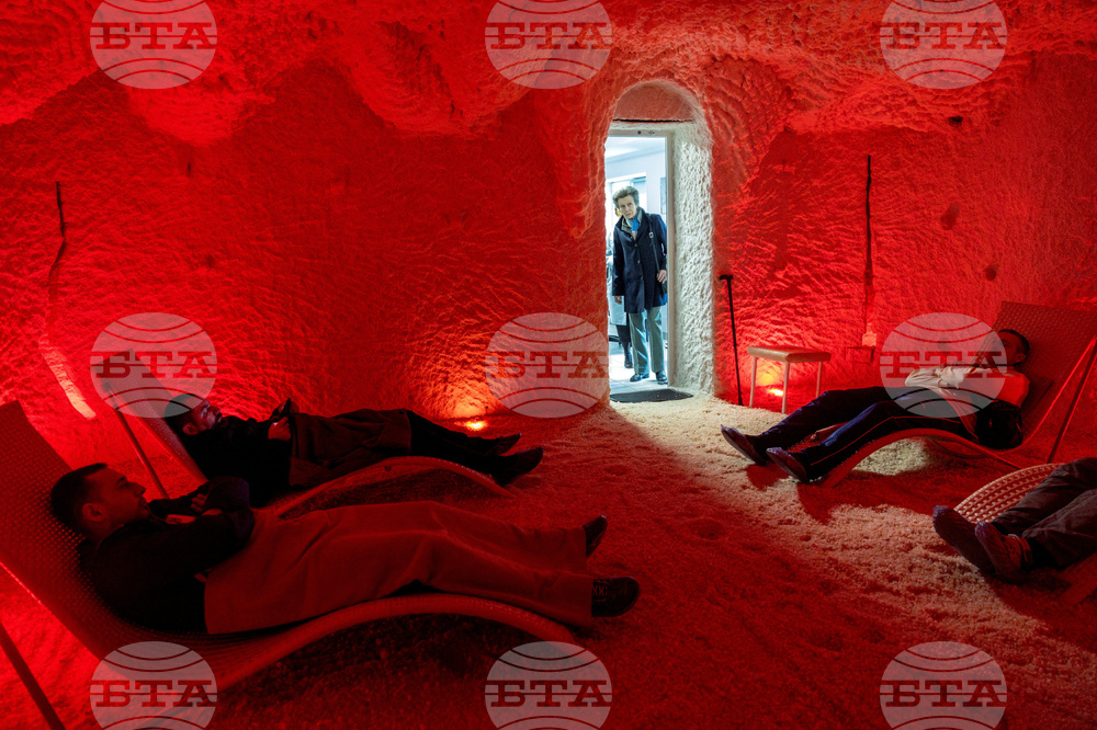 Ukrainian war veterans relax in a salt therapy room as Britain's Princess Anne visits their rehabilitation center, in Kyiv, Tuesday Sept. 30, 2025. (Thomas Peter/Pool via AP)