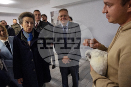 Britain's Princess Anne meets a Ukrainian veteran during his animal therapy session in a rehabilitation center, in Kyiv, Tuesday Sept. 30, 2025. (Thomas Peter/Pool via AP)