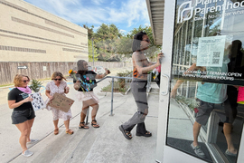 Members of Louisiana Coalition for Reproductive Freedom and supporters arrive at Planned Parenthood on the day they are closing, to deliver cards and flowers to the organization, in New Orleans, Tuesday, Sept. 30, 2025. (AP Photo/Gerald Herbert)