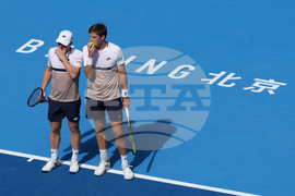 Harri Heliovaara, of Finland talks to his partner Henry Patten, of Britain during the men's doubles final match against Andrey Rublev and Karen Khachanov, of Russia in the China Open tennis tournament, at the National Tennis Center, in Beijing, Wednesday, Oct. 1, 2025. (AP Photo/Andy Wong)