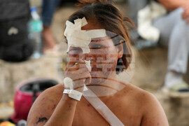 A man rests beside bodies of victims of an earthquake outside Cebu Provincial Hospital in Bogo City, Philippines, Wednesday, Oct. 1, 2025. (AP Photo/Jacqueline Hernandez)
