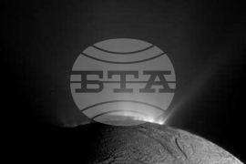 In this image provided by NASA, NASA’s Cassini spacecraft captured this image of Enceladus on Nov. 30, 2010, with the shadow of the body of Enceladus on the lower portions of the jets is clearly visible. (NASA/JPL-Caltech/Space Science Institute via AP)