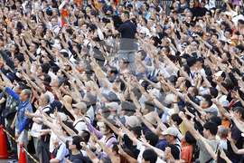 FILE- People gather during an election campaign of Sanseito party for the upper house election in Yokohama, July 19, 2025. (Kyodo News via AP, File)