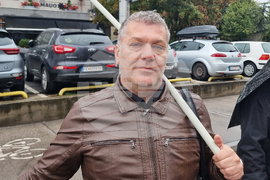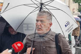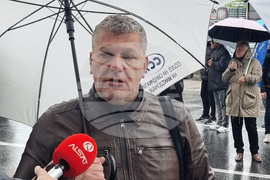 Скопие (2 октомври 2025) Синдикатът на работниците от комуналните дейности (СУТКОЗ) - единственият браншов синдикат в Северна Македония - организира протест. Причината е неизплатеното възнаграждение за месец август, както и неплатените здравни и социални осигуровки. Протестиращите са служители във фирмите „Флораком“ и „Луна“, които са дъщерни дружества на публичното предприятие „Паркове и зеленина“. На снимката: изявление на медиите дава председателят на синдиката СУТКОЗ Стоянче Кашиковски.