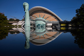 An inflatable Statue of Liberty floats in a pool outside the Haus der Kulturen der Welt museum as part of the exhibition Possibility of Unvernunft (Die Möglichkeit der Unvernunft) by satirist Jan Boehmermann and the artist collective Gruppe Royale, in Berlin, Germany, Thursday, Oct. 2, 2025. (AP Photo/Markus Schreiber)