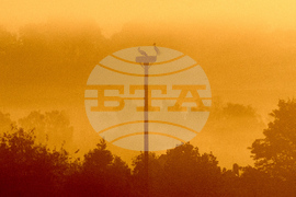 Storks sit in their nest during sunrise in Wehrheim near Frankfurt, Germany, on a misty Thursday, Oct. 2, 2025. (AP Photo/Michael Probst)
