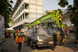 A rescuer walks past a crane prepared for the search of missing people of a building that collapsed at an Islamic boarding school in Sidoarjo, East Java, Indonesia, Saturday, Oct. 4, 2025. (AP Photo/Achmad Ibrahim)