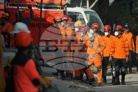 In this photo released by the Indonesian National Search and Rescue Agency (BASARNAS), rescuers carry the body of a collapsed building at an Islamic boarding school through the rubble in Sidoarjo, East Java, Indonesia, Friday, Oct. 3, 2025. (BASARNAS via AP)