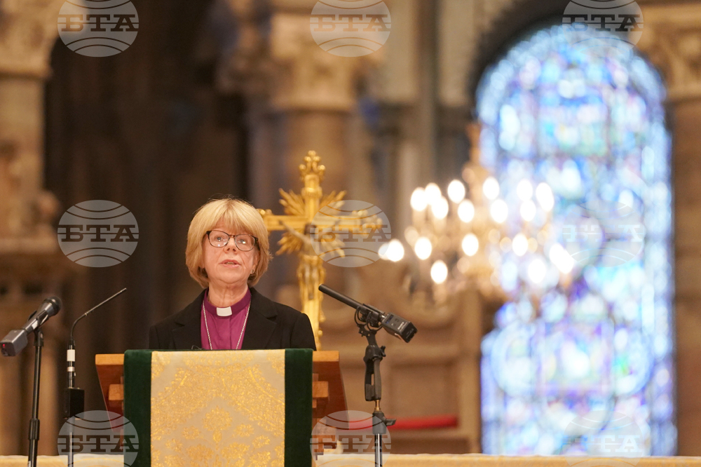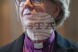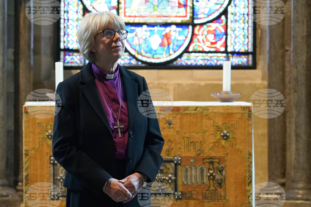 Sarah Mullally, the new Archbishop of Canterbury, left, spiritual leader of the world's 85 million Anglicans, inside Canterbury Cathedral ahead of a media conference in Canterbury, England, Friday, Oct. 3, 2025. (AP Photo/Alberto Pezzali)