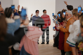 Creation directors Jack McCullough, right, and Lazaro Hernandez get applause after Loewe Spring/Summer 2026 collection presented in Paris, Friday, Oct. 3, 2025. (AP Photo/Aurelien Morissard)