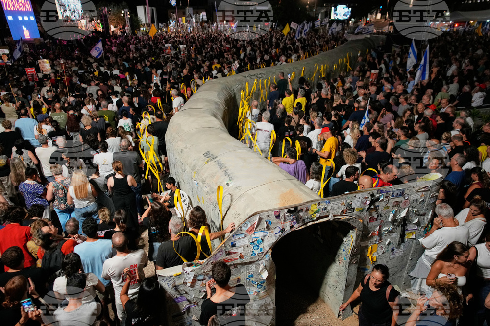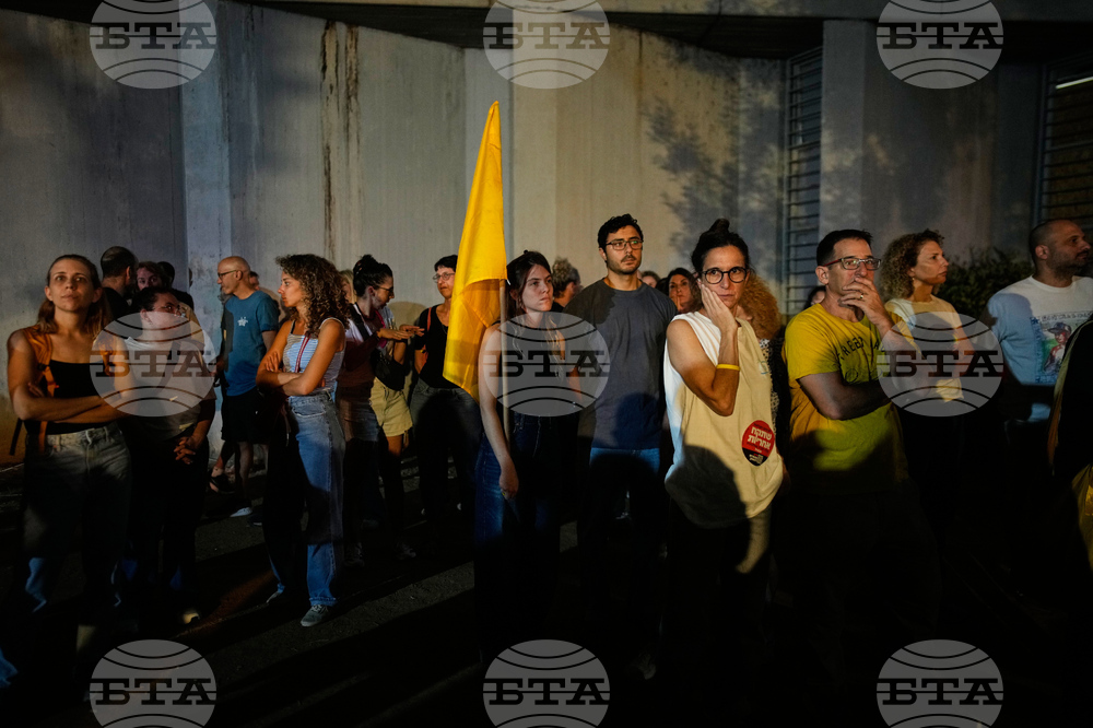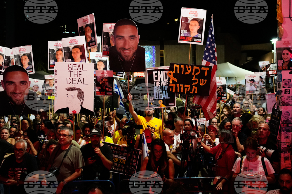 People attend a rally calling for the release of all hostages held by Hamas in the Gaza Strip and urges a ceasefire, in Tel Aviv, Israel, Saturday, Oct. 4, 2025. ahead of the second anniversary of the Israel-Hamas war. (AP Photo/Ohad Zwigenberg)