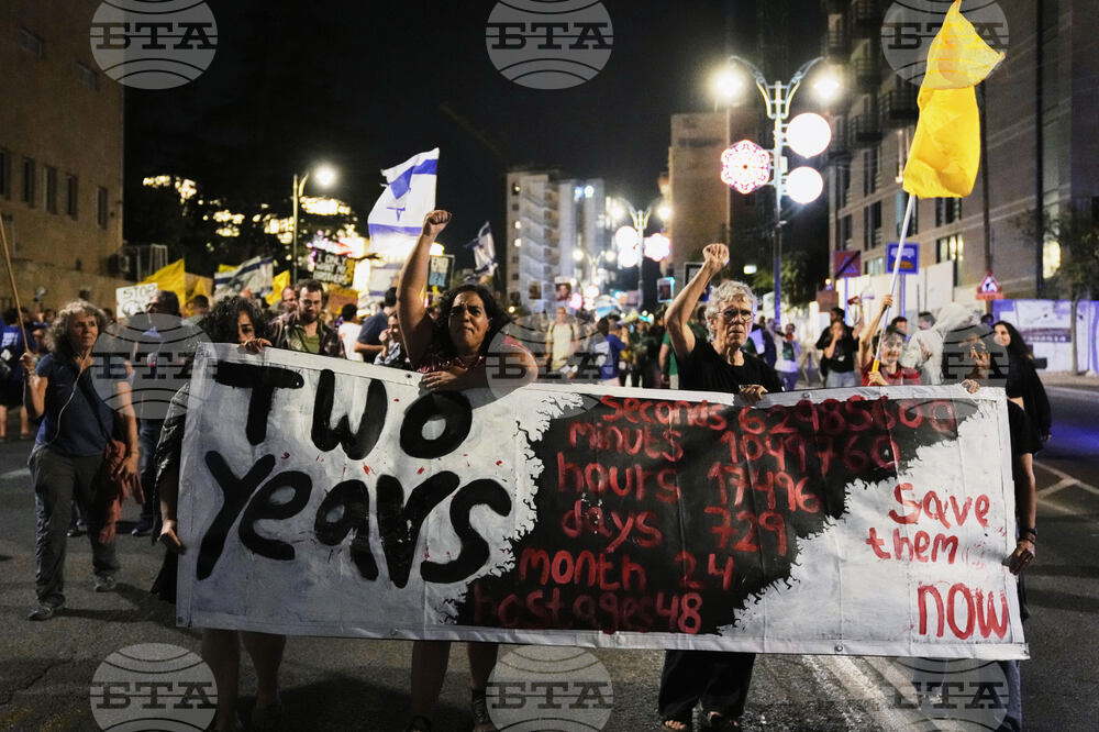 Relatives and supporters of Israeli hostages held in the Gaza Strip take part in a protest demanding their release from Hamas captivity and calling for an end to the war, in Jerusalem, Saturday, Oct. 4, 2025. (AP Photo/Mahmoud Illean)