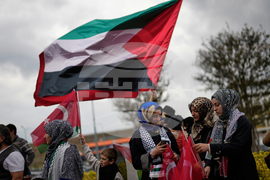 People wave Turkish and Palestinian flags as they gather outside Istanbul Airport, waiting for the arrival of 137 activists from the Global Sumud Flotilla, in Istanbul, Turkey, Saturday, Oct. 4, 2025. (AP Photo/Khalil Hamra)