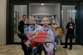 Kuwaiti activists from the Global Sumud Flotilla smile as they arrive at Istanbul Airport in Istanbul, Turkey, Saturday, Oct. 4, 2025. (AP Photo/Khalil Hamra)