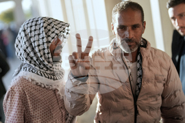 Kuwaiti activists from the Global Sumud Flotilla give the peace sign after arriving at Istanbul Airport in Istanbul, Turkey, Saturday, Oct. 4, 2025. (AP Photo/Khalil Hamra)