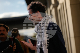 Lorenzo D'Agostino, of Italy, speaks to the media after arriving in Istanbul, Turkey, with 137 activists from the Global Sumud Flotilla, Saturday, Oct. 4, 2025. (AP Photo/Khalil Hamra)
