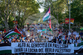 Pro-Palestinian demonstrators rally during a protest in Madrid, Spain, Saturday, Oct. 4, 2025, calling for an end to the war in Gaza. (AP Photo/Bernat Armangue)