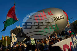 Pro-Palestinian demonstrators hold a balloon with a slogan reading: "End to the arms trade with Israel" during a protest in Madrid, Spain, Saturday, Oct. 4, 2025. (AP Photo/Bernat Armangue)