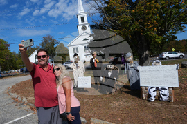 Bob and Cheryl Belanger, of Wells, Maine, take a selfie with some of the hundreds of scarecrows on display in the town commons Saturday, Oct. 4, 2025, in Chester, N.H. (AP Photo/Charles Krupa)