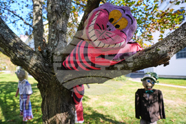A Cheshire Cat scarecrow, one of the hundreds on display, is seen in the town commons on Saturday, Oct. 4, 2025, in Chester, N.H. (AP Photo/Charles Krupa)