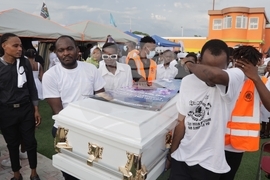 Relatives of a child killed by explosive drones targeting a suspected gang leader, mourn during the funeral in Port-au-Prince, Haiti, Saturday, Oct. 4, 2025.