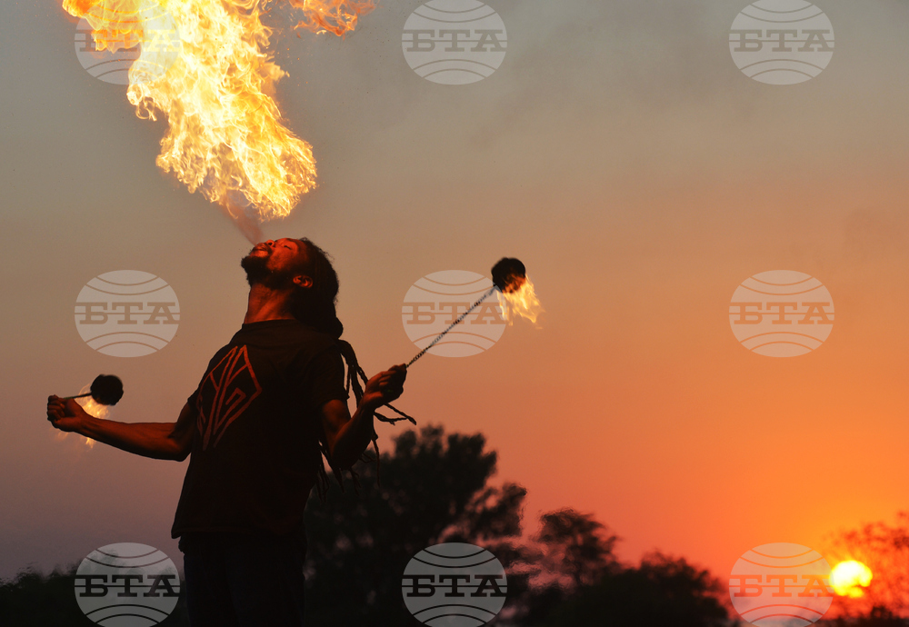 Fire dancer Nick May performs along the bluff Saturday, Oct. 4, 2025, during "Busking Day!" held in downtown St. Joseph, Mich. (Don Campbell/The Herald-Palladium via AP)