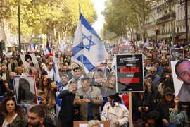 People demonstrate in support of Israeli hostages held in the Gaza Strip and demanding their release from Hamas captivity, Sunday, Oct. 5, 2025 in Paris. (AP Photo/Thomas Padilla)