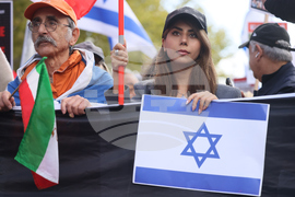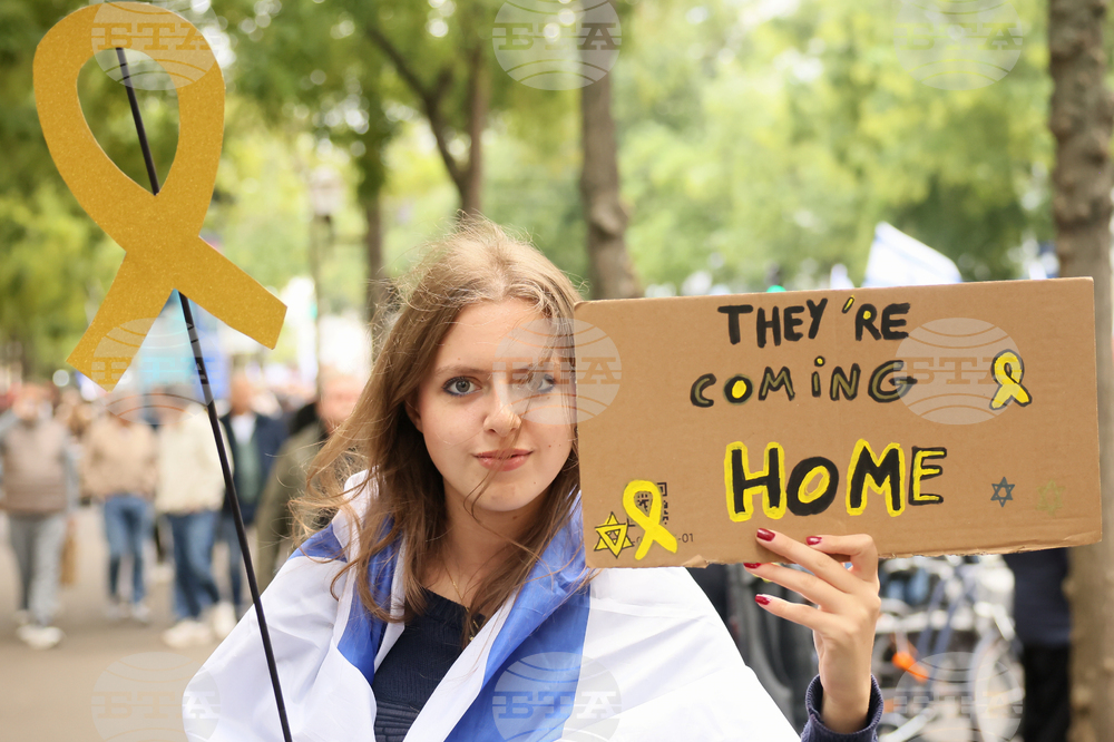 People zqve Israeli flags as they demonstrate in support of Israeli hostages held in the Gaza Strip and demanding their release from Hamas captivity, Sunday, Oct. 5, 2025 in Paris. (AP Photo/Thomas Padilla)