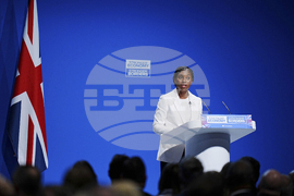 Conservative Party leader Kemi Badenoch during the Conservative Party Conference at the Manchester Central Convention Complex, Manchester, England, Sunday Oct. 5, 2025. (Danny Lawson/PA via AP)