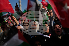 People gather waving Palestinian and Turkish flags during a pro-Palestinian rally in Istanbul, Turkey, Sunday, Oct. 5, 2025. (AP Photo/Khalil Hamra)