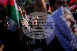 People chant slogans and wave Palestinian and Turkish flags during a pro-Palestinian rally in Istanbul, Turkey, Sunday, Oct. 5, 2025. (AP Photo/Khalil Hamra)