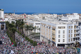 Tens of thousands take part in a march in support of Palestinians in Gaza and against normalizing relations with Israel, in Rabat, Morocco, Sunday, Oct. 5, 2025. (AP Photo/Mosa'ab Elshamy)