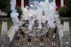 Bavarian riflemen and women in traditional costumes fire their muzzle loaders on the last day of the 190th Oktoberfest beer festival in Munich, Germany, Sunday, Oct. 5, 2025. (AP Photo/Matthias Schrader)