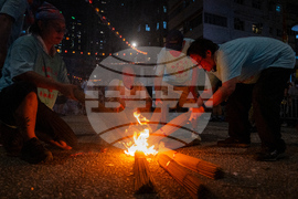 Participants burn incense sticks during the Tai Hang Fire Dragon Dance performance to celebrate the Mid-Autumn Festival in Hong Kong, Sunday, Oct. 5, 2025. (AP Photo/Chan Long Hei)