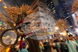 A fire dragon made of straw studded with incense sticks, is paraded during the Tai Hang Fire Dragon Dance performance to celebrate the Mid-Autumn Festival in Hong Kong, Sunday, Oct. 5, 2025. (AP Photo/Chan Long Hei)