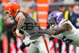 CORRECTS ID OF VIKINGS PLAYER TO DALLAS TURNER NOT KAHLEF HAILASSIE Cleveland Browns quarterback Dillon Gabriel (8) is tackled by Minnesota Vikings' Dallas Turner (15) during the first half of the NFL game between Minnesota Vikings and Cleveland Browns at the Tottenham Hotspur stadium in London, Sunday, Oct. 5, 2025. (AP Photo/Kirsty Wigglesworth)