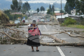 An Indigenous woman traverses roadblocks placed by demonstrators protesting the elimination of the diesel subsidy by President Daniel Noboa's, government in Cayambe, Ecuador, Sunday, Oct. 5, 2025. (AP Photo/Dolores Ochoa)