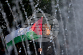 A man takes part in a pro-Palestinian rally in Bucharest, Romania, Sunday, Oct. 5, 2025. (AP Photo/Andreea Alexandru)