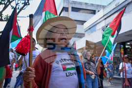 Demonstrators take part in a pro-Palestinian march in Guatemala City, Sunday, Oct. 5, 2025. (AP Photo/Moises Castillo)