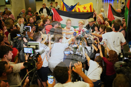 Former Barcelona mayor Ada Colau arrives at the airport in Barcelona, Spain, Sunday, Oct. 5, 2025 after being arrested on the Global Sumud Flotilla and subsequently released by the Israeli authorities. (AP Photo/Joan Mateu Parra)