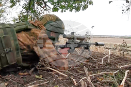 In this photo taken from video distributed by Russian Defense Ministry Press Service on Monday, Oct. 6, 2025, a Russian sniper fires towards Ukrainian forces from an undisclosed location. (Russian Defense Ministry Press Service via AP)