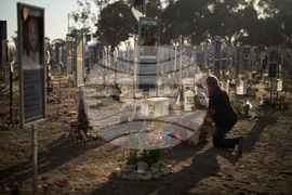 Jojo Rabia cleans a box used for lighting candles as he visits the site where his two sons were killed on Oct. 7, 2023, cross-border attack by Hamas militants at the Nova music festival, near the Kibbutz Reim, southern Israel, Monday, Oct. 6, 2025. (AP Photo/Leo Correa)