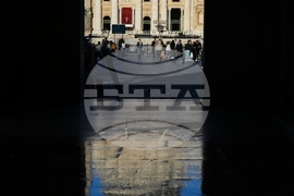 St. Peter's Basilica is reflected on a wet pavement, in Rome, Monday, Oct. 6, 2025. (AP Photo/Andrew Medichini)