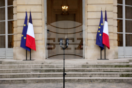 A microphone is set up in the courtyard for the statement by French outgoing Prime Minister Sebastien Lecornu at the Hotel Matignon in Paris, Monday, Oct. 6, 2025. (Stephane Mahe/Pool via AP)