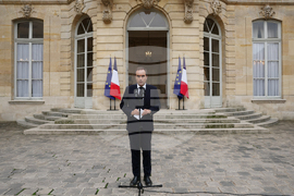French outgoing Prime Minister Sebastien Lecornu, who resigned just a day after naming his government, delivers his statement at the Hotel Matignon in Paris, Monday, Oct. 6, 2025. (Stephane Mahe/Pool via AP)