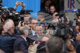Bruno Retailleau, center, head of the Conservative Party Les Republicains and outgoing Interior Minister, leaves after a meeting at the party headquarters Monday, Oct. 6, 2025 in Paris after France's prime minister Sebastien Lecornu resigned plunging the country into a deep political crisis. (AP Photo/Thibault Camus)