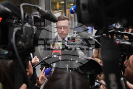 Reporters gather outside the conservative Party Les Republicains headquarters Monday, Oct. 6, 2025 in Paris after France's prime minister Sebastien Lecornu resigned plunging the country into a deep political crisis. (AP Photo/Thibault Camus)