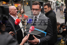 French far right National Rally party president Jordan Bardella answers reporters following a meeting, after France's prime minister Sebastien Lecornu resigned plunging the country into a deep political crisis. Monday, Oct. 6, 2025 in Paris. (AP Photo/Christophe Ena)