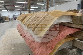 Wooden hockey sticks are stacked as they move along the assembly line at the Roustan Hockey factory, which is the last major manufacturer of hockey sticks in Canada on Aug. 27, 2025 in Brantford, Ontario. (AP Photo/Kelvin Chan)